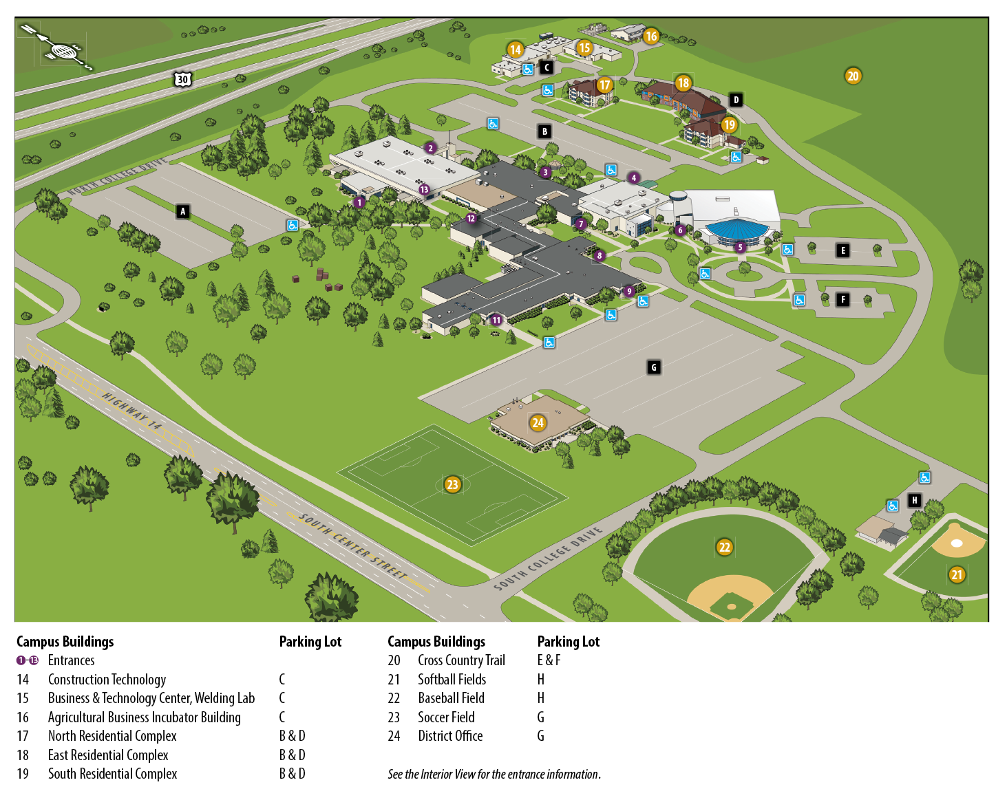 Marshalltown Community College is located at 3700 S. Center St. in Marshalltown, Iowa. The campus is just south of the intersection of Highways 30 and 14. Take Highway 14 south to the first or second campus entrance (on the east side of the road). MCC Administration, Admissions and Student Services offices are best reached by taking the northernmost campus entrance. Check the campus maps below for additional access information.